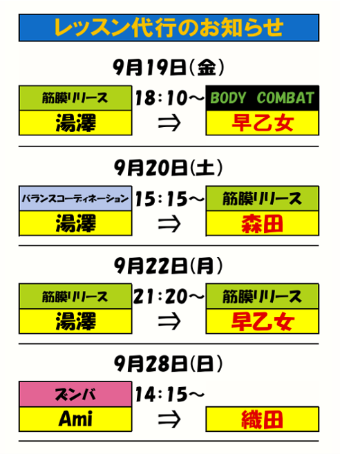 9月 レッスン代行のお知らせ
