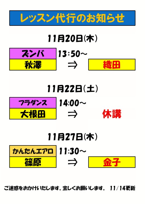 11月レッスン代行・休講のお知らせ